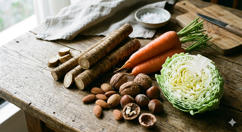 Firm and fibrous, these foods require strong chewing and activate jaw muscles.